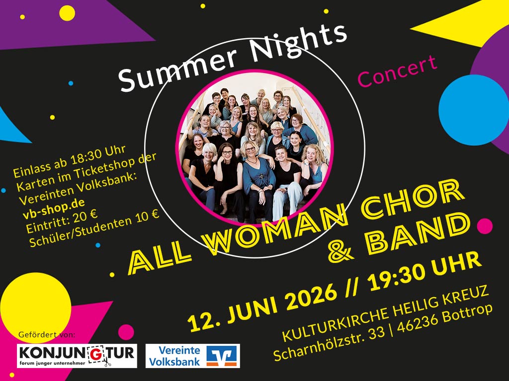 Summer Nights – All Woman Chor & Band. Inspiriert vom gleichnamigen Song aus dem Kultfilm Grease laden der All Woman Chor und seine Band zu einem musikalischen Sommerabend voller Energie, Lebensfreude und Gefühl ein.